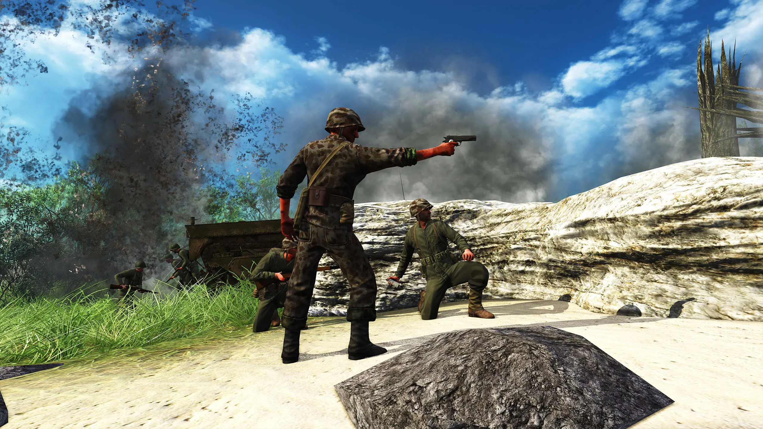 The map features scripted events, including tank battles, bombers flying overhead dropping bombs, and a kamikaze plane attacking a nearby ship.